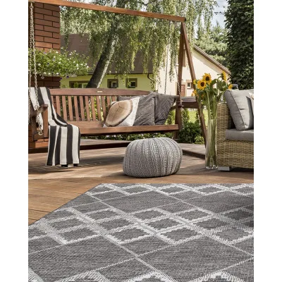 Athena Kilim er et fladvævet tæppe, der kan anvendes både indendørs og udendørs. Tæppet er prydet med et rombelignende mønster i hvidt. Her ses Athena Kilim i en grå farve.
