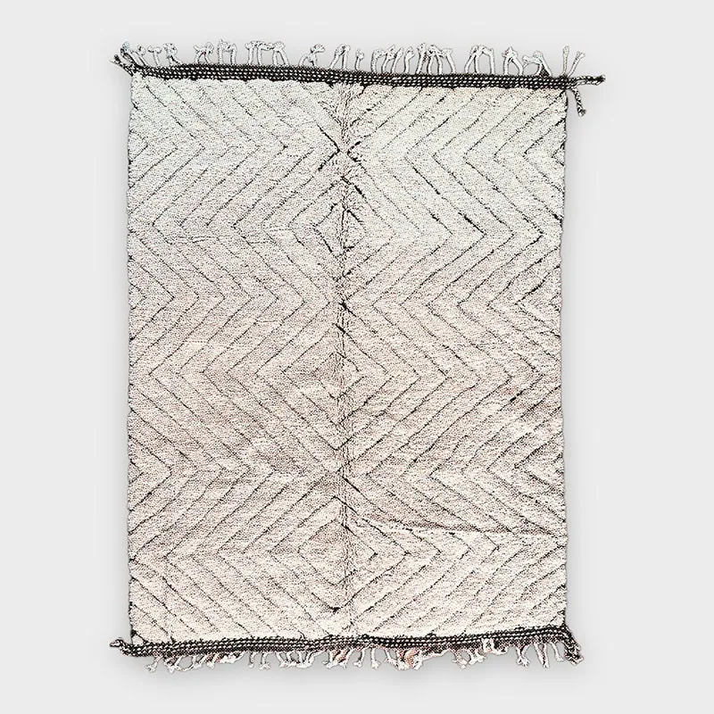 Beni Ouarain tæppe har en bund af brun kelim, som kommer smukt til syne i 3D format. Den lyse vamsede uld danner et ensformet zig zag mønster.