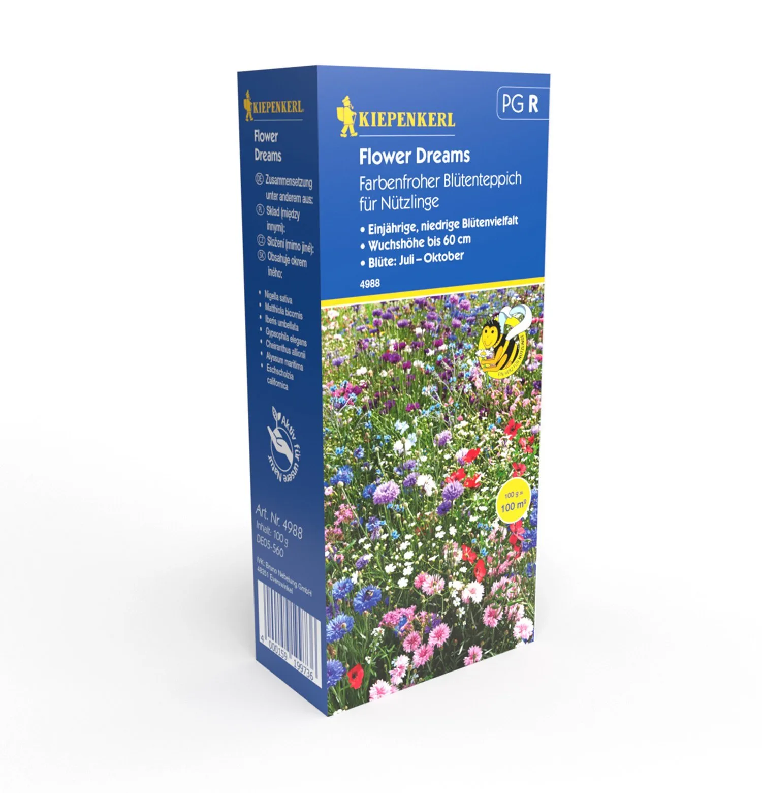 Blomsterblanding Blomster Drøm. Denne blanding giver et farverigt tæppe af blomster til gavnlige insekter. De lavvoksende planter danner et ensartet, farverigt tæppe af blomster i haven. Blandingen dækker jorden godt og skaber en stor kontrast, især