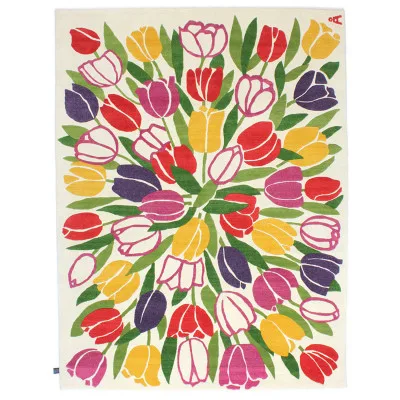 Et smukt, moderne, håndknyttet tæppe af højeste kvalitet. Tæppet med de herlige farver og det smukke blomstermønster er et tæppe fra det svenske firma Axeco. Design af Anna-Johanna Ångström. Fotograferet i størrelsen 140 x 200 cm.
