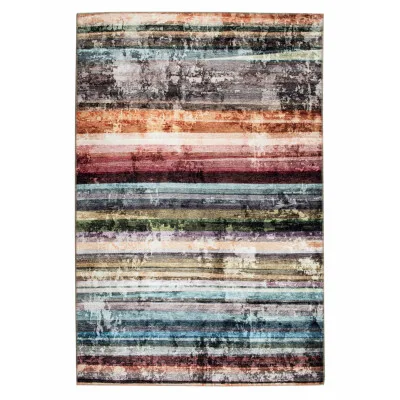 Cadiz er et maskinvævet tæppe, vævet med et stribet mønster i flotte og behagelige farvetoner. Tæppet har en vis glans takket være det bløde og skinnende chenillegarn. Her ses Cadiz i varianten 005 stripe.
