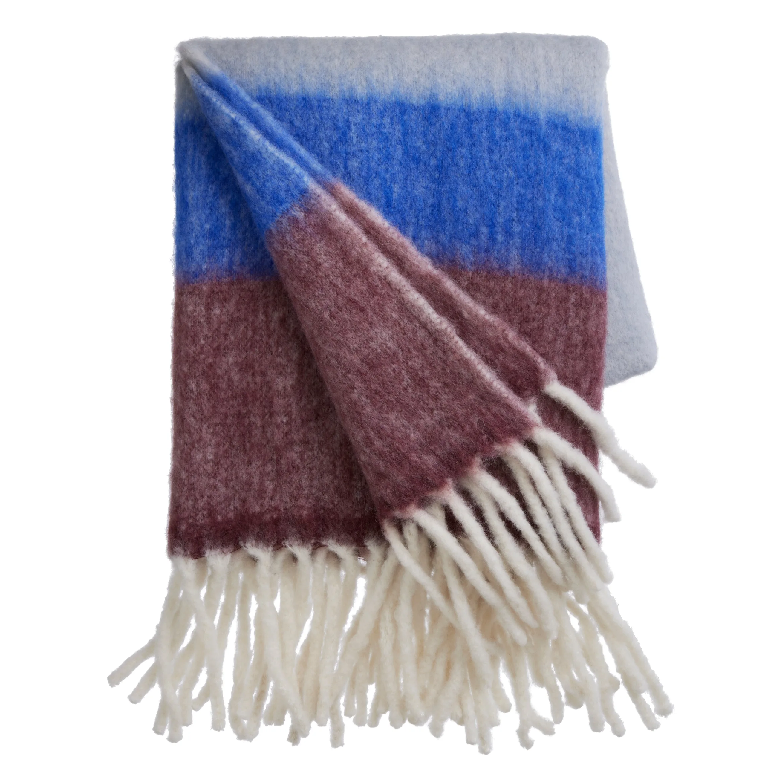 Stribet tæppe i nuancer af creme, blå og bordeaux med frynser for enden. Tæppet er fremstillet i en uldblanding og måler 130 x 170 cm.