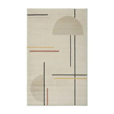 Florence Modern er et maskinvævet tæppe med en kort skåret luv. Tæppet har et grafisk, stilrent mønster bestående af linjer og halvcirkler i farverne creme, terracotta, gul og sort. Her ses Florence Modern i farven creme/multi.