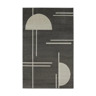 Florence Modern er et maskinvævet tæppe med en kort skåret luv. Tæppet har et grafisk, stilrent mønster bestående af linjer og halvcirkler i greige og naturhvide farvetoner på en sort bund. Her ses Florence Modern i farven sort.