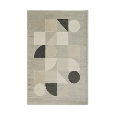 Florence Shapes er et maskinvævet tæppe med en kort skåret luv. Tæppet har en grå bundfarve med et grafisk mønster bestående af cirkler, firkanter og trekanter i sort, grå og natur. Her ses Florence Shapes i farven grå.