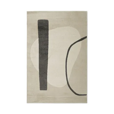 Florence Stone er et maskinvævet tæppe med en kort skåret luv. Tæppet har en hørfarvet bund med et blødt, abstrakt mønster i farverne sort og cremehvid. Her ses Florence Stone i farven hør.