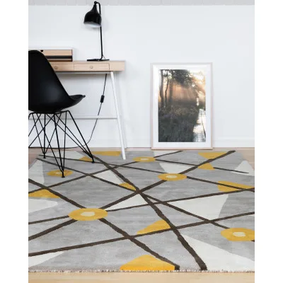 Geometry er et håndtuftet uldtæppe designet af Stina Hagström. Tæppet er dekoreret med et geometrisk mønster i grå og gul. Luven i fin kvalitetsuld er tyk og tæt. Tæppet bliver en skøn indretningsdetalje, der nemt pifter rummet op, især hvis der er behov