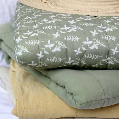 Smukt grønt vattæppe, quiltet med blomster og striber.