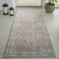 Tæppe til gulv – lang gulv løber i vintage stil med slidt look. Et fin tæppe som pynter på gulvet. Farverne er i dæmpet orange – lyserød – rød. Materiale: chenille polyester Mål: ca. 80×200 cm Design: House Nordic