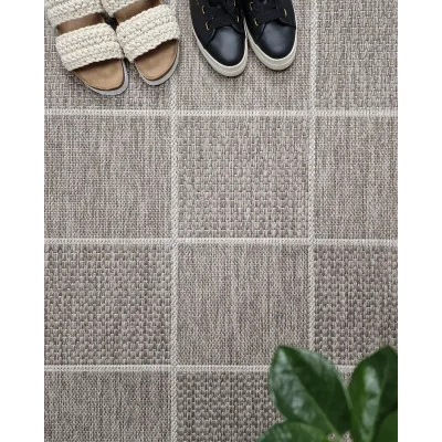 Madrid Square er et fladvævet tæppe med et ternet mønster. Bagsiden er gummieret, hvilket sikrer, at tæppet ligger stabilt på gulvet. Her ses Madrid Square i farven mørkt linned.