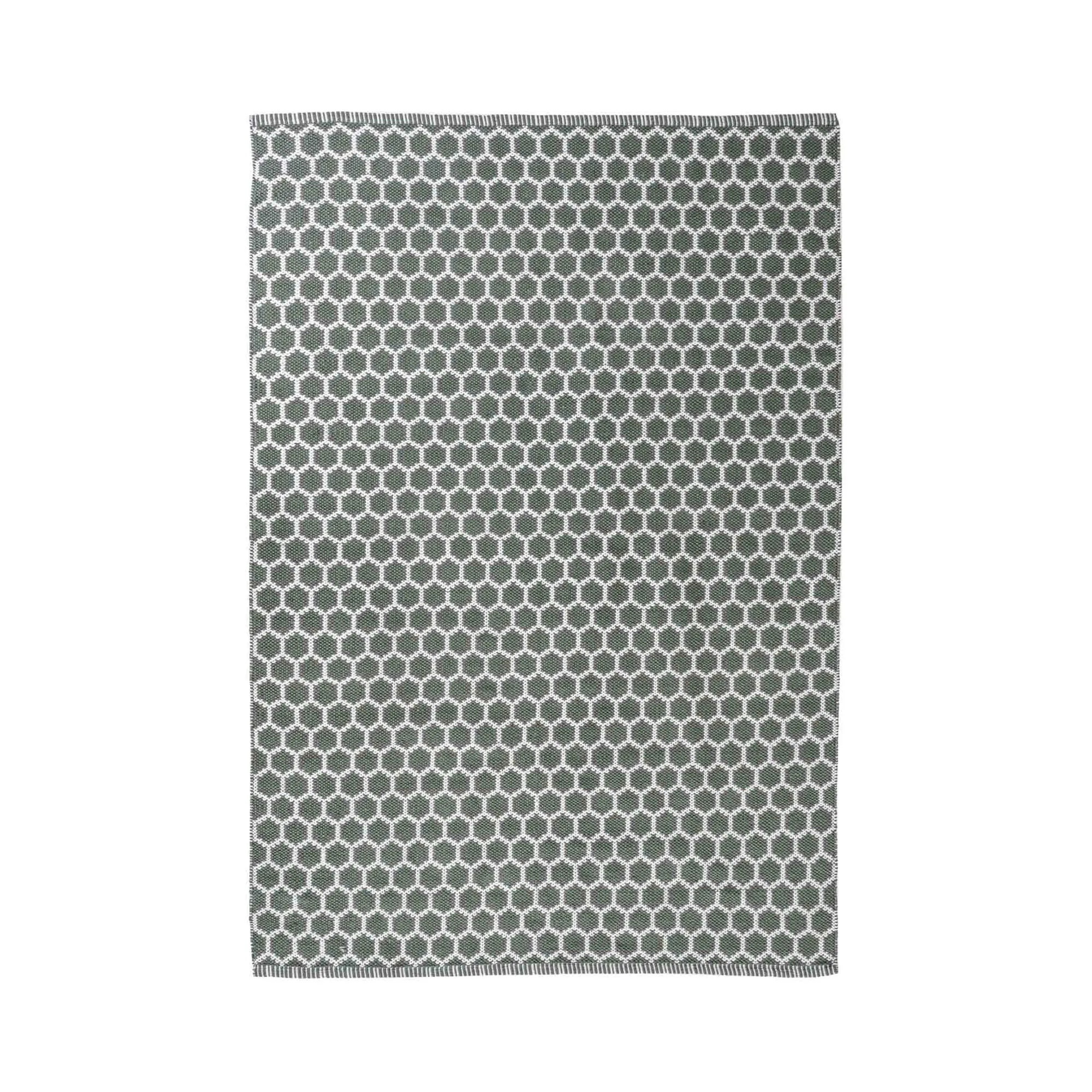 Narbonne Tæppe – Vævet tæppe i grøn – lavet af 100%25 genanvendt plastik 140×200 cm Farve: Grøn, Hvid Materiale: PET genbrugsplast Mål: Længde – 140 cm, bredde – 200 cm og højde: 1 cm.