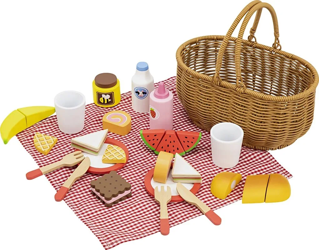 Nu kan børn tage på en sjov picnic med vennerne med Vikas picnicsæt i træ! Den smukke picnickurv af kunstige siv kommer med et komplet tilbehørssæt i træ med 26 dele og et ternet tæppe….