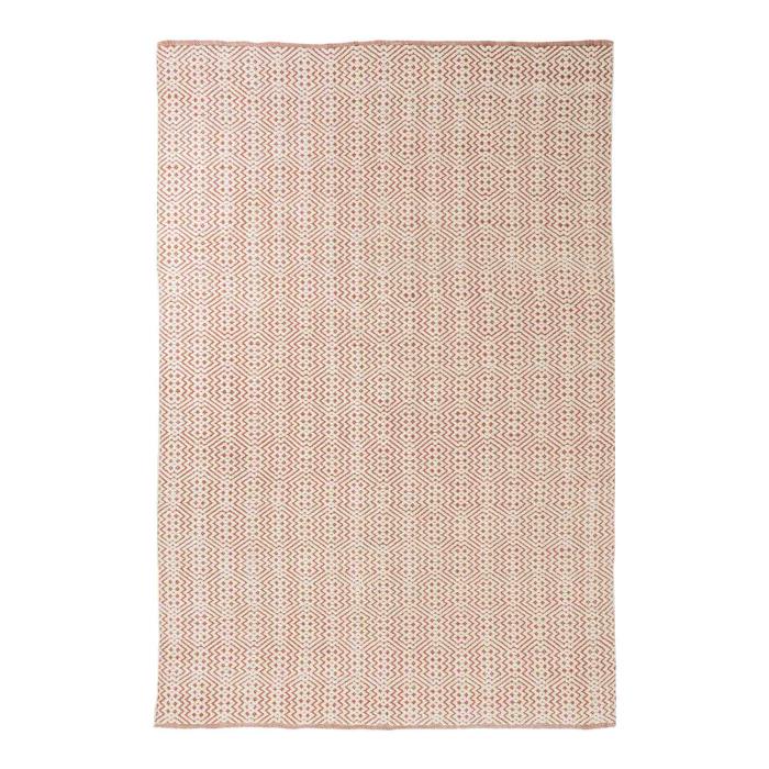 Dette tæppe i mørk koral er lavet udelukkende af PET-garn, der består af genanvendte plastikflasker, der er spundet til en ultratynd polyestertråd.
