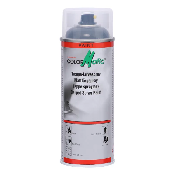 Med Colormatic tæppe og tekstil spray kan du nemt genopfriske eller indfarve falmet og misfarvet tæppe /- tekstil – findes i 2 farver Sort eller Antracitgrå.