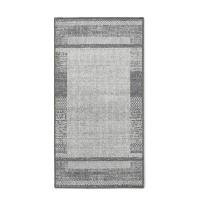 Trendy er et maskintuftet tæppe med en gummieret bagside, der sikrer, at tæppet ligger stabilt på gulvet. Dette flotte tæppe har en meleret grundfarve og en ramme i forskellige mønstre langs kanterne. Her ses Trendy i farven grå.