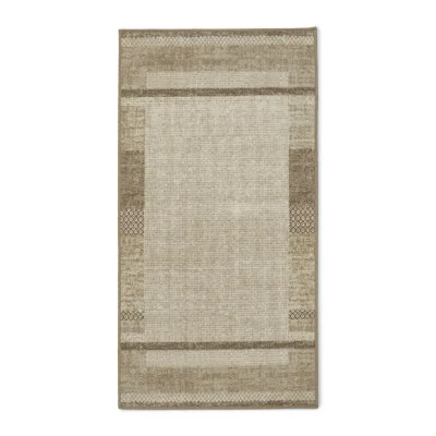 Trendy sand er et maskintuftet tæppe i farven beige med en gummieret bagside, der sikrer, at tæppet ligger stabilt på gulvet. Dette flotte tæppe har en meleret grundfarve og en ramme i forskellige mønstre langs kanterne.